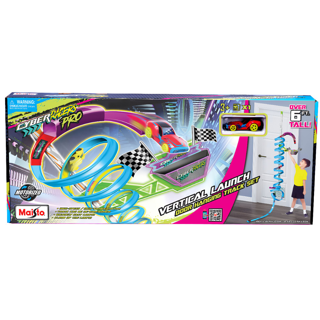 A készlet tartalmazza: a Cyber Racer hátrahúzós járművet, 10 hurokhoz elegendő pályát, csatlakozókat, ajtófelakasztót és a céllal ellátott pályaelemet.