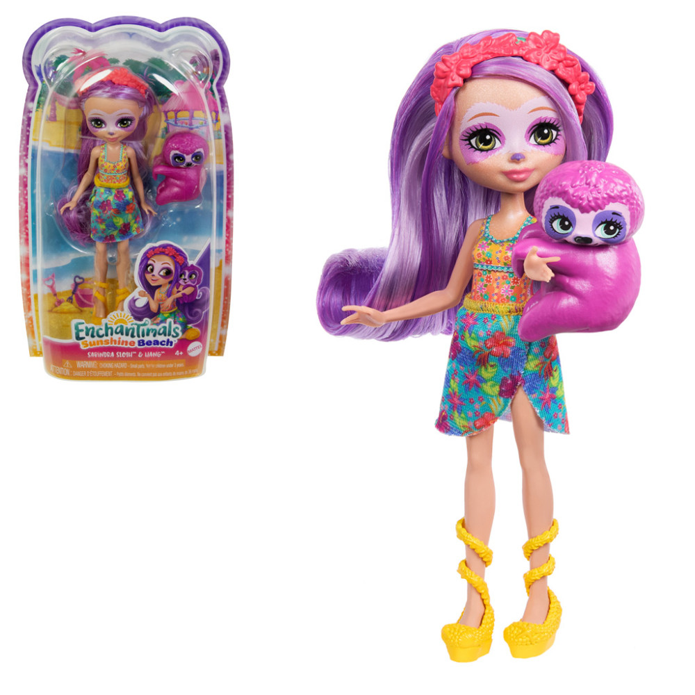 A bájos EnchanTimals babák és állat barátaik mindenkit könnyedén elvarázsolnak. Az EnchanTimal barátok olyan különleges kapcsolatban állnak az állatokkal, hogy még hasonlítanak is rájuk. Sabindra Sloth, a lila lajhár lány kis kedvencével, Hanggal együtt várja, hogy a kislányok új, izgalmas történeteket játsszanak el vele. A 8 cm magas baba színes, virágmintás szoknyát és sárga cipőt visel, megjelenését virágos hajpántja és gyönyörű haja teszi teljessé.