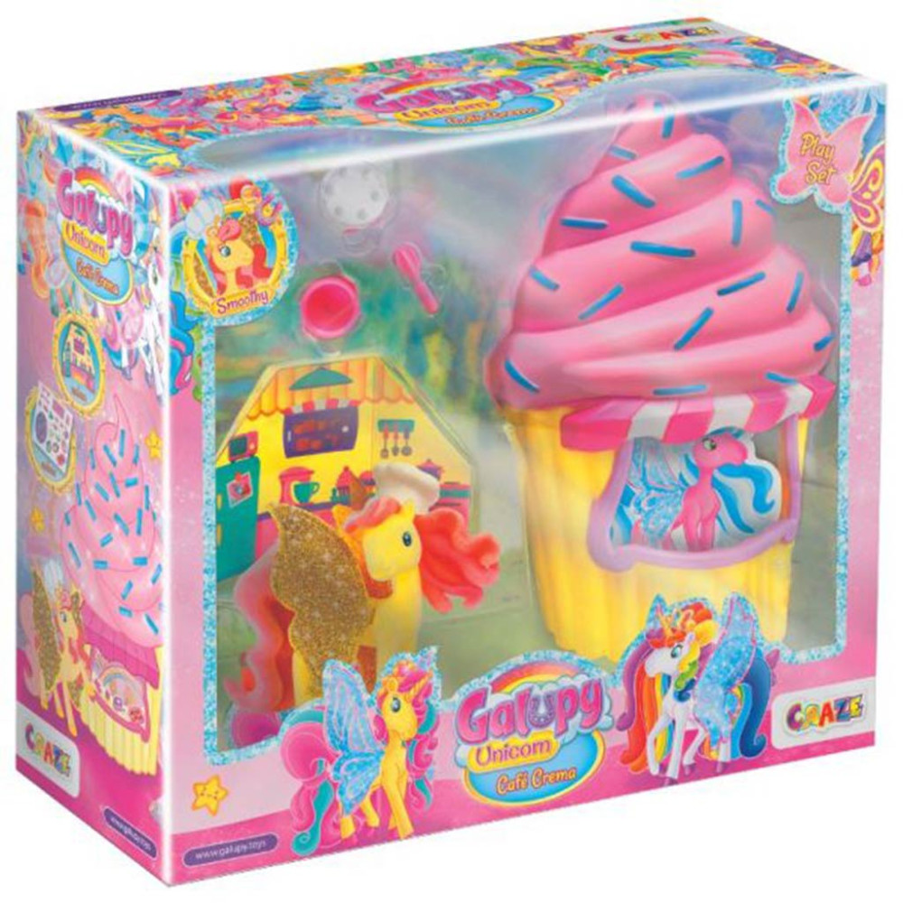 Az Unikornis sütiző játékszettel a gyerekek megnyithatják a Café Cremát, és Smoothie-val, az csillogó, arany színű szárnyakkal rendelkező, séfsapkát viselő unikornis figurával különböző történeteket játszhatnak el. A cupcake formájú sütizőben egy dioráma segíti a történetmesélést, valamint a készlet különböző matricákat is rejt, amellyel a gyerekek feldíszíthetik az üzletet. A habverő és a keverőtál segítségével Smoothie elkészítheti specialitását, amely után a vendégek garantáltan megnyalják majd mind a 4 patájukat.