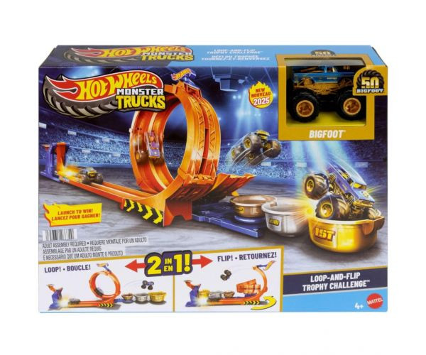 Indulj el egy hatalmas kalandra a Hot Wheels Monster Trucks 50. évfordulós Bigfoot hurokpálya szettel! Ez a különleges játékkészlet a legendás Bigfoot monster truckot ünnepli, és izgalmas kaszkadőrmutatványokra hív. A szett középpontjában egy látványos narancssárga hurokpálya áll, amelyen a Bigfoot teherautó száguldhat át, hogy megcélozza a győztesek kupáját.