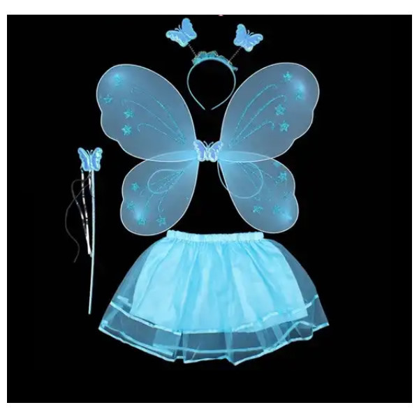 Pillangó jelmez. Tartalma: Szárny - szalaggal rögzíthatő a hátra, tüll szoknya - gumírozott, pálca, fejdísz.