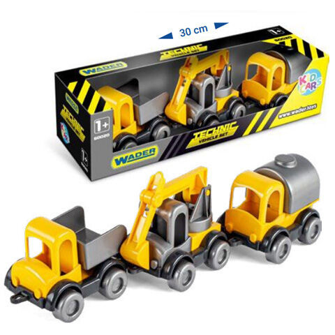 Jellemzők: Kid Cars munkagépek 3 db-os szett 1 db folyadékszállító kamion 1 db billencs 1 db markológép Anyaga: műanyag Ajánlott: 1 éves kortól Kor: 1+